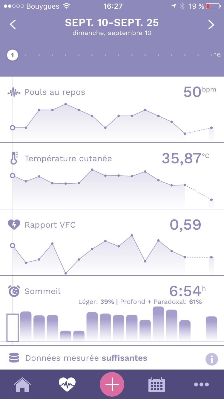 Grâce à de nombreux capteurs, Ava est une montre qui mesure des données autour de 9 paramètres dont votre température, votre fréquence cardiaque, votre temps de sommeil… Tous ces paramètres évoluent au cours de votre cycle.